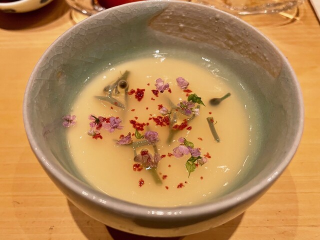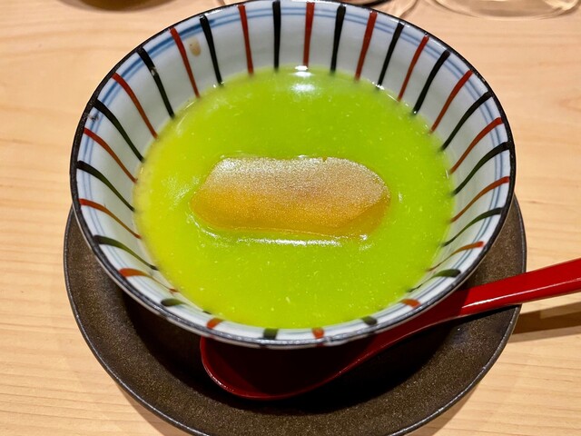 先付け:知多半島のタイラギ貝の貝柱 セリ よもぎ麩 蝦夷鮑 うすい豆のすり流し