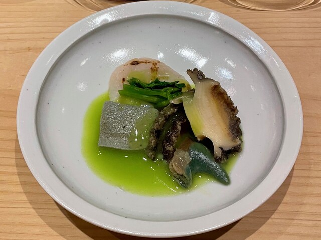 よもぎ麩 蝦夷鮑 うすい豆のすり流し