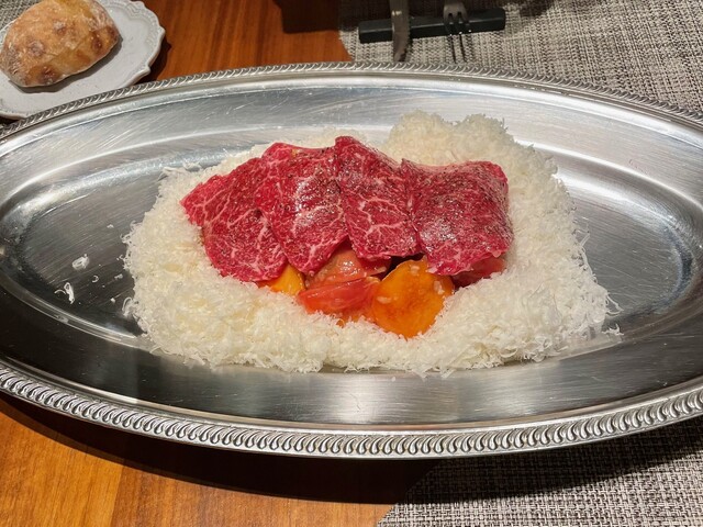 "三田牛ラムシンのステーキ" は、表面が揚げ焼き
