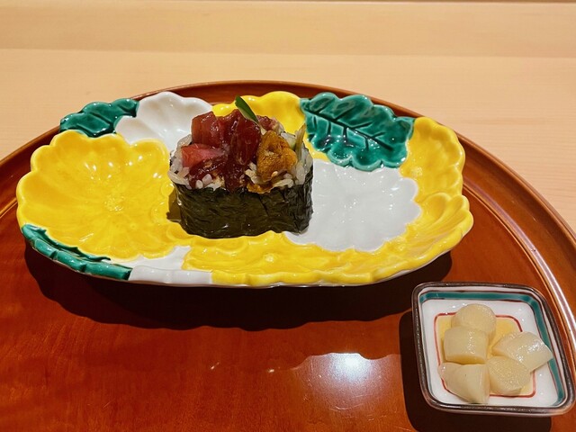 赤身づけ山葵和え・中トロ・雲丹・穴子・胡瓜