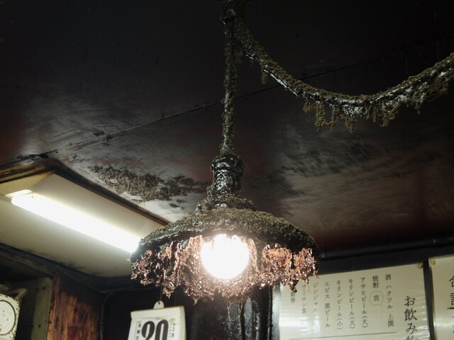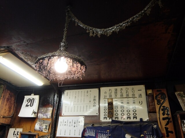 カウンターのみのお店、照明はうなぎを炙った煙と油が滴り、まるでオブジェのよう・・・