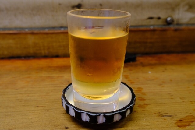 金宮焼酎のストレート、それに卓上のシロップを足して頂きます。