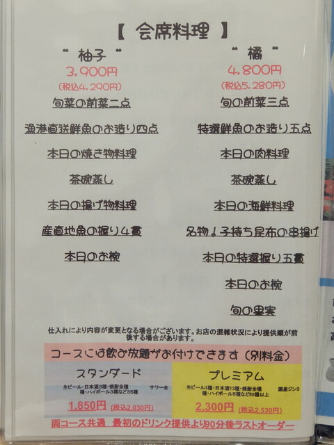 予約したのは、懐石の「ゆず」コース、それに店内のほとんどのドリンクが飲み放題になる、まさにプレミアム飲み放題をつけます。