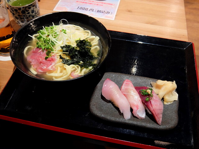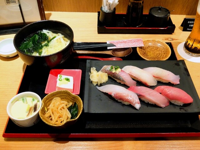 ランチは、定番の「すくも丼」が健在、握り、海鮮丼をメインに、新たに魚介出汁のうどんと握りのセットが加わっています。