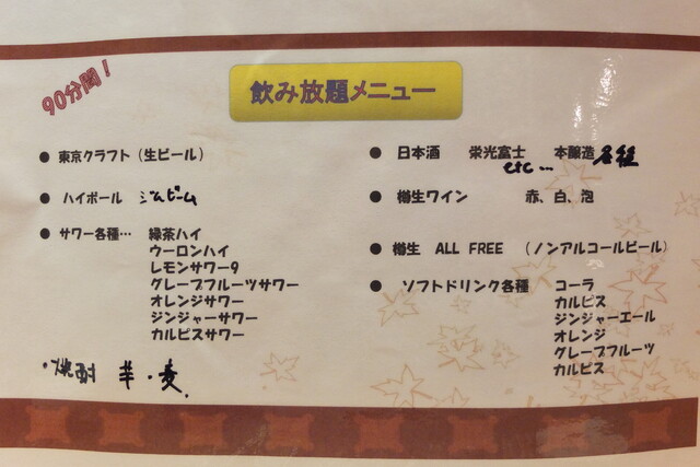 飲み放題はアルコール類とソフトドリンクなど十種類ちょっと。
