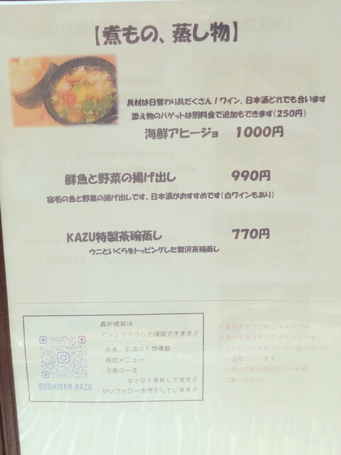 お寿司屋さんとしても、バーとしても使えるお店、メニューも海鮮に偏らずにバラエティに富んでいるので、今後ちょくちょくお邪魔するかもしれません。