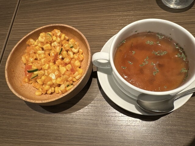 はじめにサラダとおつまみのパスタ揚げがでてきます。その後スープ