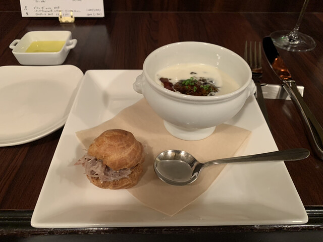 テリーヌは鹿肉の強さとインカのめざめ(ジャガイモ)とのミルフィーユの取り合わせと濃厚な赤ワインソースがこちらもマッチして、クラムチャウダーとのコントラストが相まって、止まらない美味しさ。