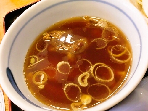 ネギがたっぷり いつもよりも黒く黒胡椒が浮いてるスープ
