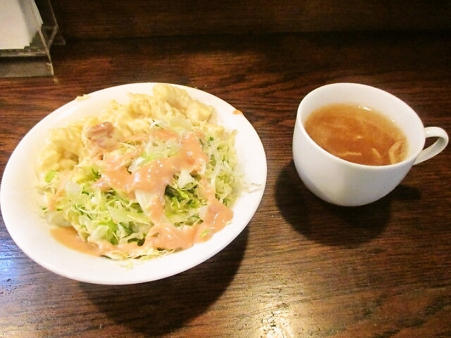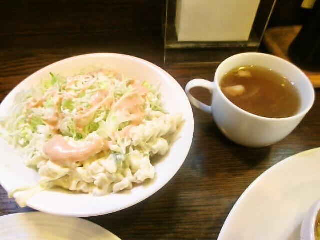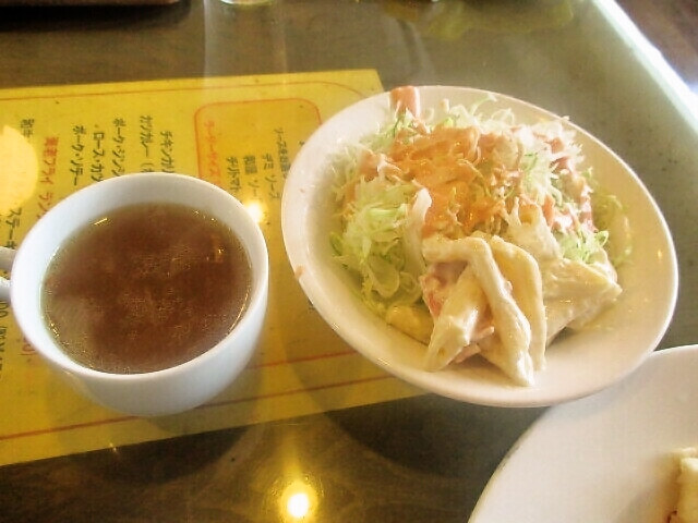 定番のサラダ この日のスープは 具沢山のコンソメ