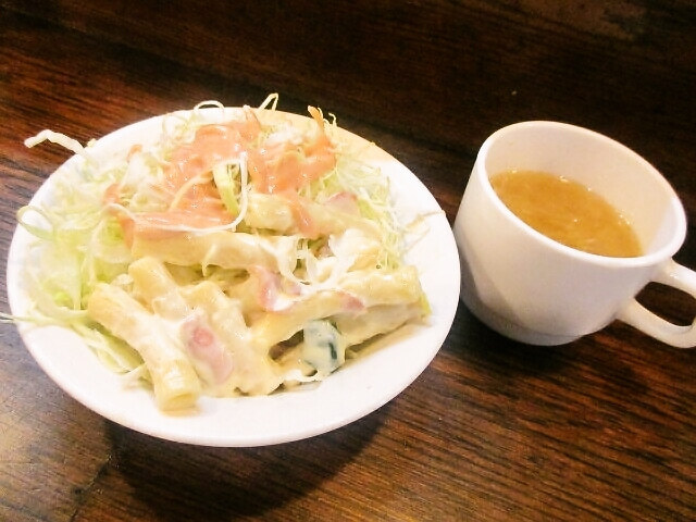 スープは中華風玉子スープ サラダは いつもと同じですが マカロニが リボンマカロニ