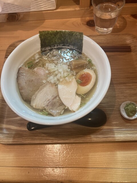 細麺が選べます。ラインナップは醤油と同じかな、肝心のスープは、あー、これが塩なのかーと感動します。一口目のインパクトから風味が少しずつ変わるというか慣れてきていろいろ美味いなーと。そして、味変にどうぞ、とワサビ。スープほんの少し足してゆるくしてある。芸が細かい。最後の最後にワサビたしてのスープ、あらー、これは美味しい。そしてテーブルに両肘ついてドンブリ持ち上げてズズズズーっと飲み干しちゃう。ラーメン屋はこうでなくては。やめられませんね。
