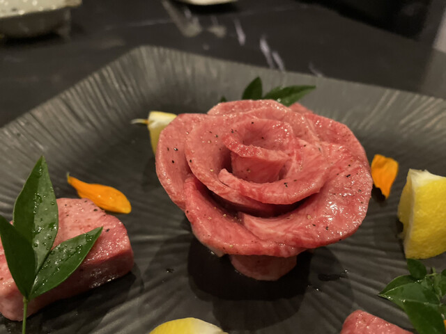 ・もはや芸術の域に達する盛り付け。綺麗に盛り付けられた薄切りのタンと、厚切りのタン。薄切りは甘味がありお口の中で心地の良い歯応え。また厚切りタンはこりっとした贅沢な食感、共に岩塩を少し振りかけ召し上がりますと、甘味と旨味が強調されとても至福の味わいが楽しめました。