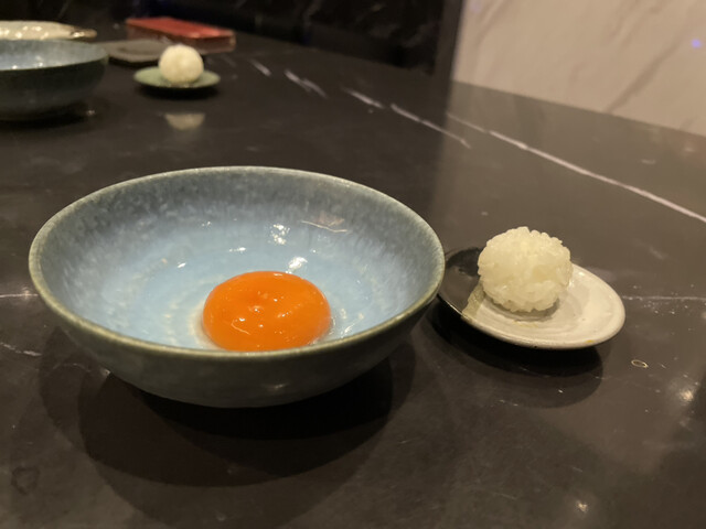 ・田村牛サーロインを軽く炙り黄身を絡ませライスボールに巻いて頂きます。一口サイズ。