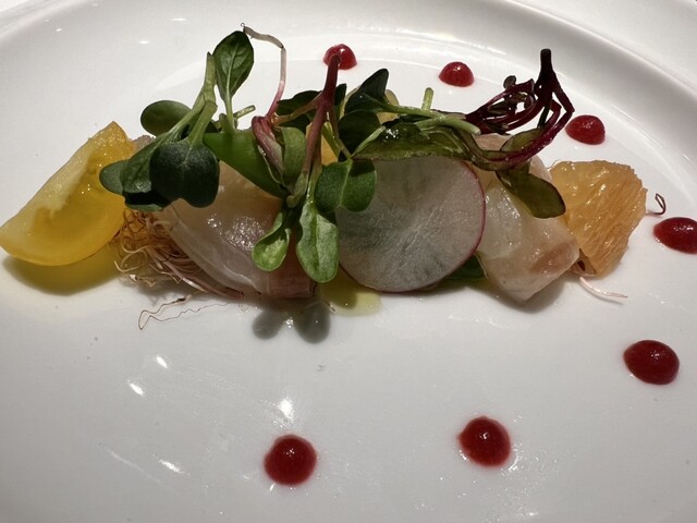 前菜: カンパチと甘海老のマリネ、フランボワーズソース