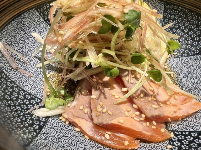 季節の逸品: 北海道道南産のサクラマスの炙り、茗荷載せ