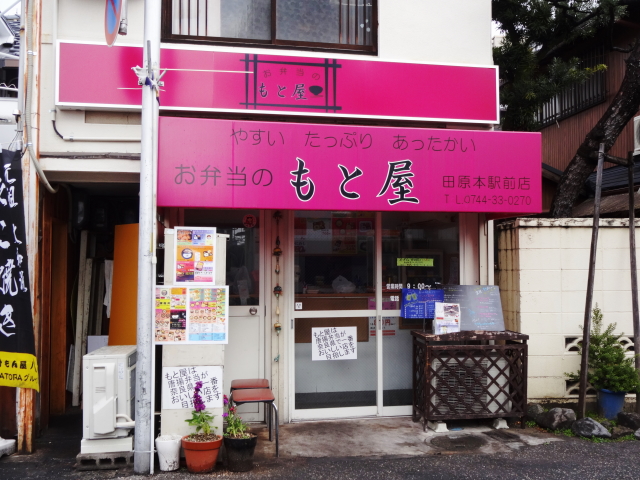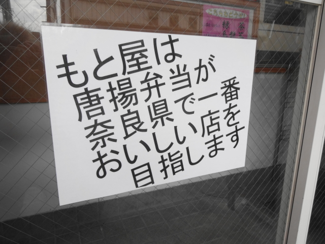 この日は田原本駅の周辺をぶらぶらと散策してたのですが、店先に貼られてた「もと屋は唐揚弁当が奈良県で一番おいしい店を目指します」のキャッチフレーズにつられて、ついつい入店。