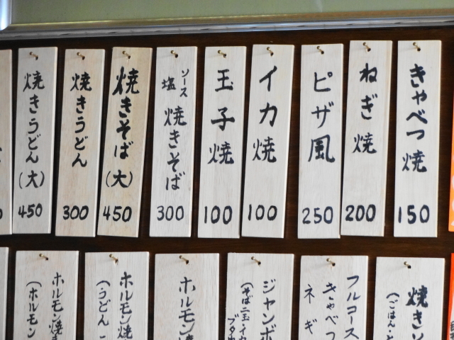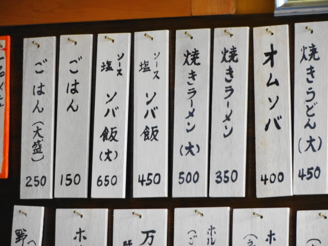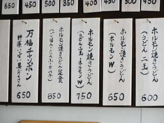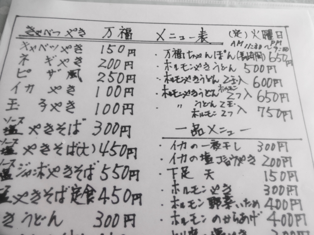 他のメニューは、「ネギ焼き」200円、「イカ焼き」100円、「焼きそば定食」450円、「ホルモン焼きうどん」500円、「万福ちゃんぽん」650円、などなど。