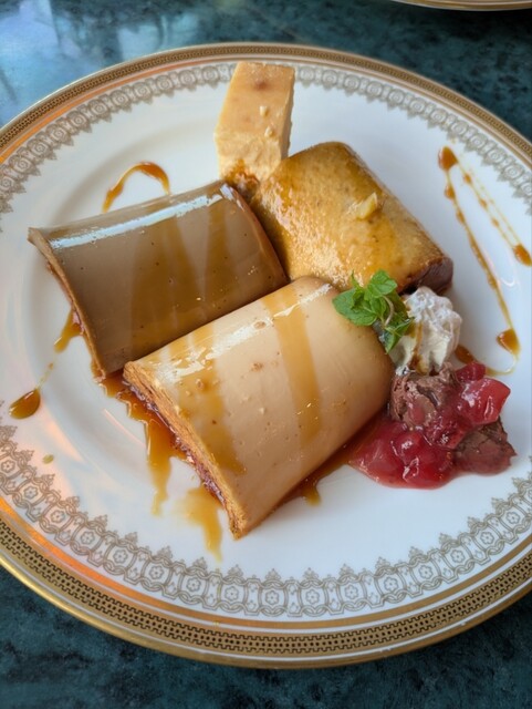 3種のプリンがランダムでハーフカット提供、つまり1.5個のビーカープリンと付け合わせのソースにチーズケーキ