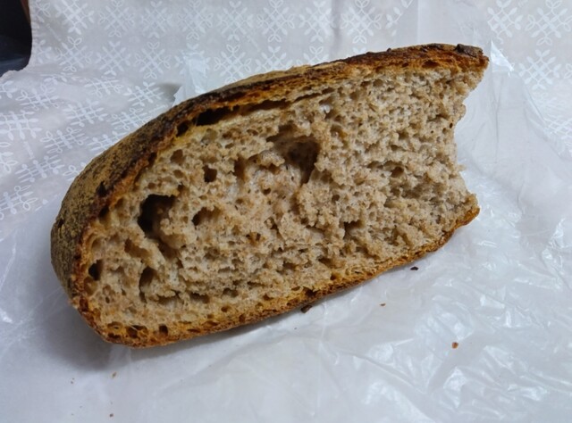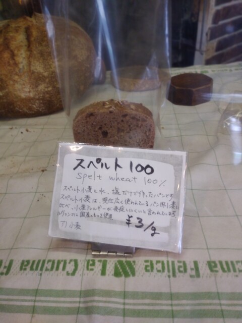 私が行ったときは、12時頃だったのに、棚はほぼ売り切れてわしなかわら、説明しづらかったです。ほんのり醤油の「玄米キッシュ」350円ほんのり醤油味で、トッピングされたチーズと良いマッチングしてて美味しかったです(^^)。あと、カンパーニュ生地にゴーダを盛り込んだ、チーズボルケーノ(グラム2円)…生地が…美味しかったから、ゴーダチーズか入ってるだけですが、十分な美味しさでした。スペルト100(g3円)はどんなかなぁ…スペルト高いし、粉だけでグラム3円でした。どんな違いを感じれるかなぁ。