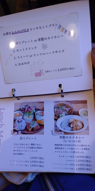 メニューは定期的に変わるらしい「彩プレート(1650円税込)」にしました。私が頼んだときは、優しい甘さの南瓜スープに始まり、インド料理のミールスのような仕上がりの素敵な仕上がりのプレートが来ました。後でお話ししたら、予想通りの、ミールスをイメージしたプレートだそうです(^^)