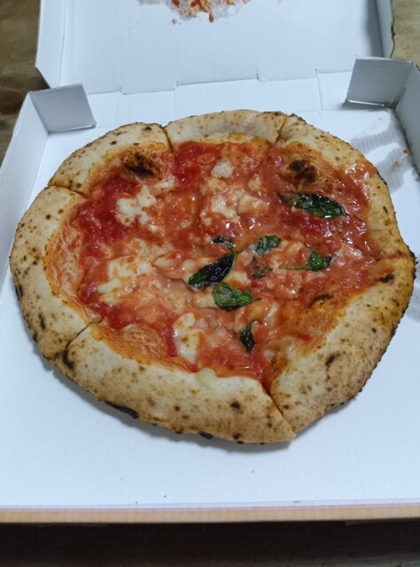 今回が初だったので、分かりやすいメニューのマルゲリータ1848円+箱代100円にしました。ポテトはサービスです←塩っぱくなくて美味しヘルシでした♪。で帰宅、20分前後かかってしまったので、出来立て、熱々、のピザではなかったけど、ピザ生地の味と風味が、ホントその辺のピザとは違うのが、目をつぶって食べても余裕で分かるくらい違います。美味しぃ〜!(^^)