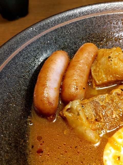 15分くらいでスープカレー到着。いつも通りに黙々と食べ進めます。安定の美味しさ。ここのソーセージは塩味が抑えてあるのでカレーと食べるのにピッタリです。