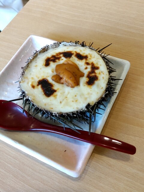 うにグラタンはうにの殻に入ってます。真ん中生ウニ、ホワイトソースの中にもうにが混ぜてありどこを食べてもうにを味わえます。これももちろん美味い!