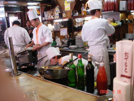 火加減を見ている真ん中のコックは、3〜4人前のランチ用ナポリタンスパゲティを1度に作っている・・