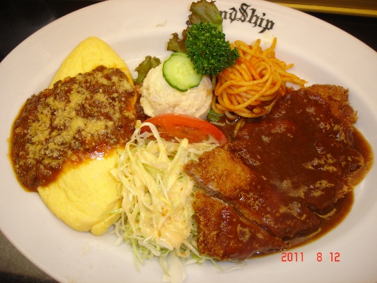 今日は、トンカツ(デミグラスソース)とプレーンオムレツ(ミートソース)です・・