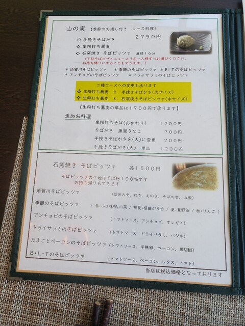 メニューは基本"山の実コース"のみでピッツァは5~6種類の中からの選択になり、殆どのお客様は通常の"山の実コース"ですが若干のアレンジは可能(写真のメニューを熟読下さい)ですが蕎麦だけの注文は出来ません。