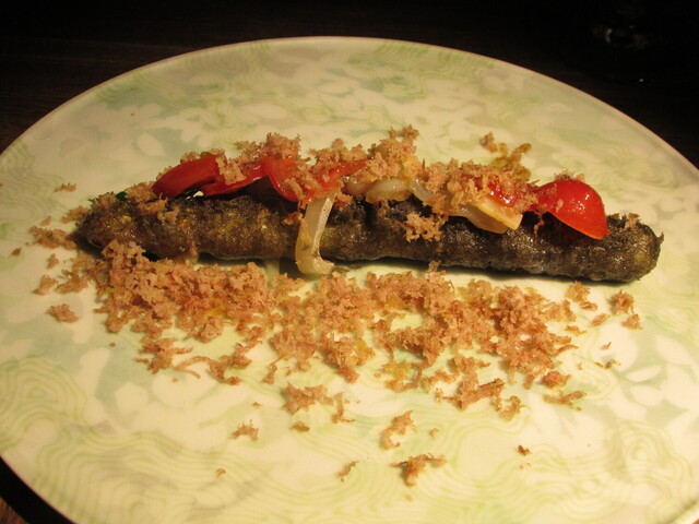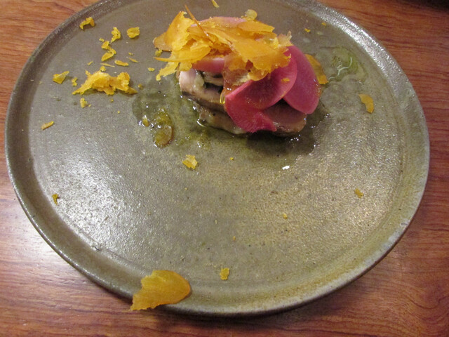 仔羊とあん肝のソーセージ、羊の風味濃厚(^_^)。根菜、シャキシャキ(^_^)