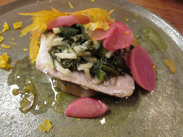 鰆 豊洲から来たあん肝 腐乳(豆腐を発酵させたソース)兵庫県で作られる豆腐のソース ほうれん草のソース 柚子と白味噌のピューレ レモンミントオイル