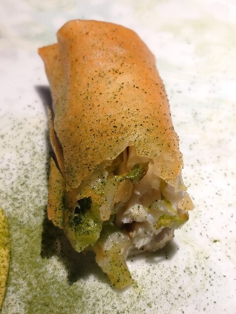 春巻き、最初牡蠣の風味、カリフラワーのマヨネーズで、太刀魚の風味が際立つ~(^_^)