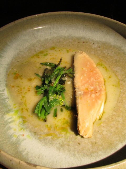 ・減圧調理したたら白子と菜の花のスープ仕立て 黄色のカリフラワー