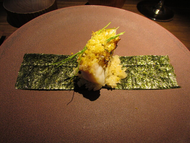 鰆フレッシュ、あん肝とろとろ、柚子の酸味と玄米のカリカリ食感がアクセントに