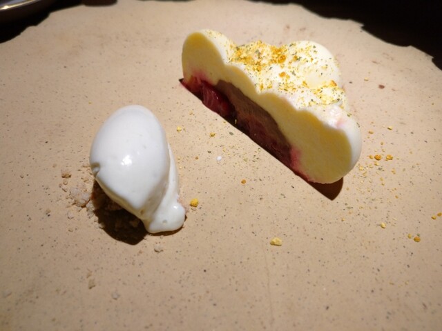 赤ワインのシロップを減圧調理した苺 ココナッツのエスプーマ ホワイトチョコとフォアグラのテリーヌ