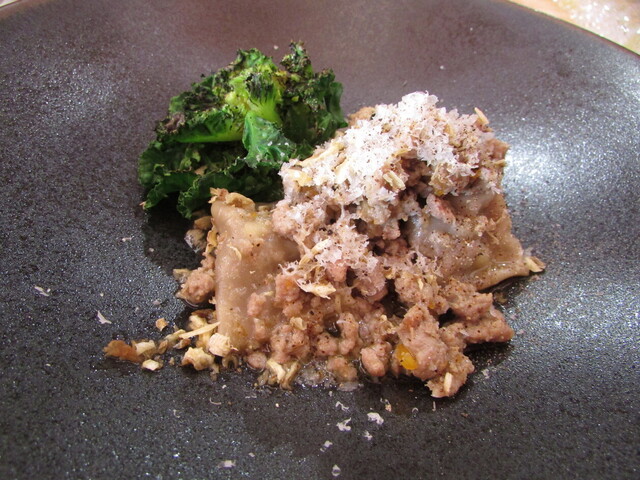 鰻の赤ワイン煮込み ナポリピカンテ(サラミ) 黒トリュフ 神戸市西区産のホワイトコーン