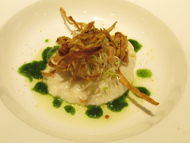 ・帆立 マッシュ里芋 牛蒡のチップス 菊菜のピューレ
