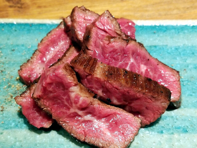 しっかりとネギとローズマリーの香りが付いたレアステーキの完成です。