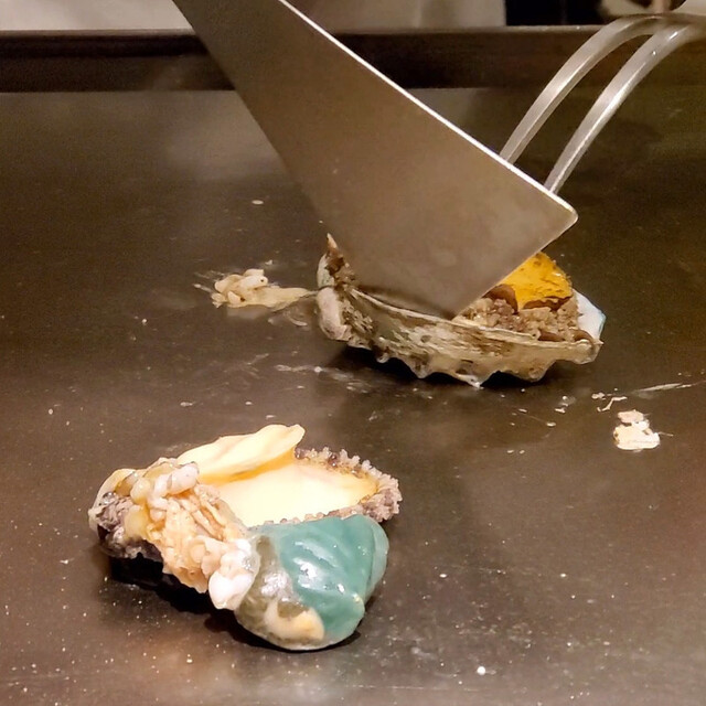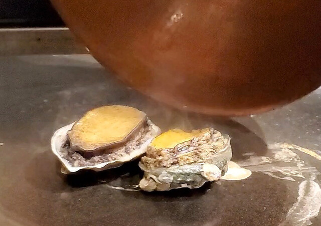 鉄板で蒸した後、蓋を開けると、ぷっくりと身が膨らんだアワビが登場。