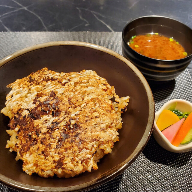 サーロインの牛脂を使ったガーリックライスに、カリカリのおこげを乗せて。別腹で何杯でも食べられそう。