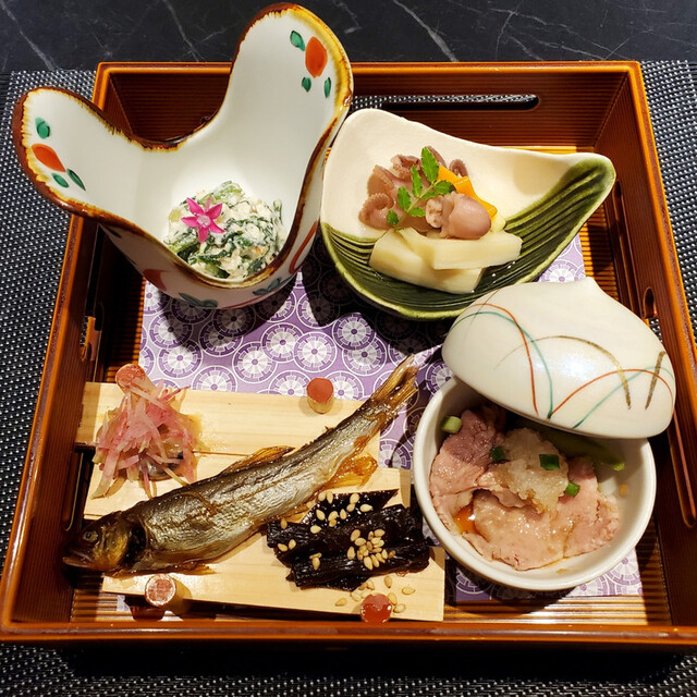 春菊の白和え、飯蛸と筍、鰊の塩麴焼、稚鮎、きゃらぶき、和牛しゃぶしゃぶ