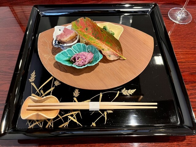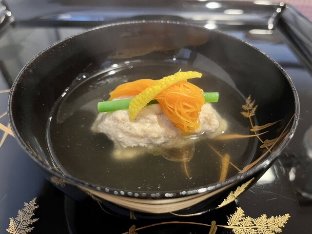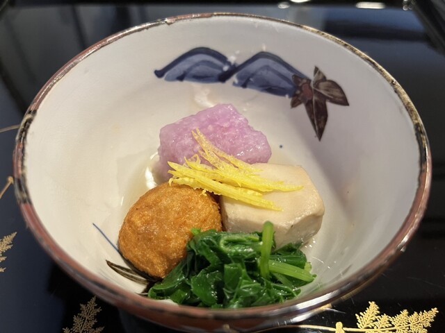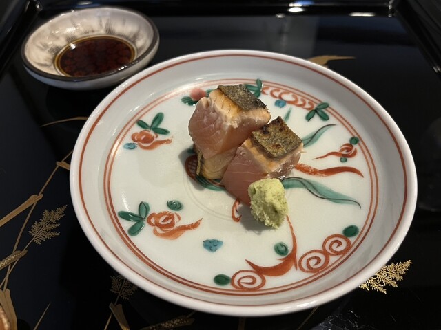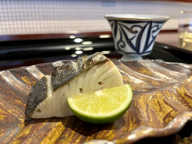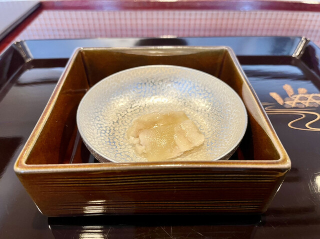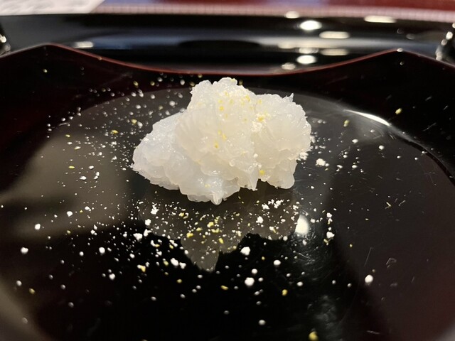 美しい紫色をしたシャキシャキ食感のかきのもと(菊)から始まり、椀盛の鮭のこかわ煮は村上の郷土料理だそうで、鮭のすり身に、ダシ汁と鮭の皮やはらこを入れて作る鮭のしんじょ。はじめていただきましたが、とても美味しかったです。表面だけ焼いたレアな鮭の焼き〆も食感が素晴らしくって♡