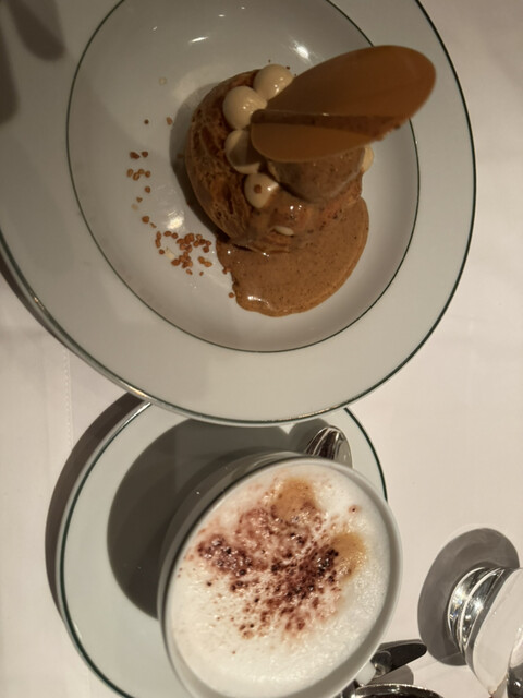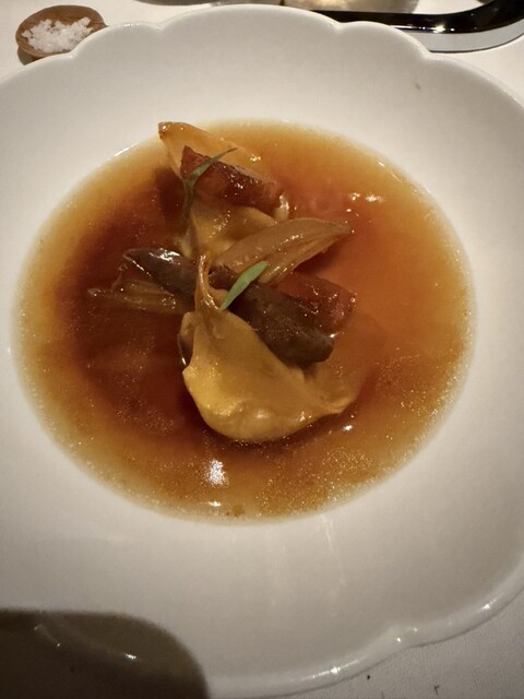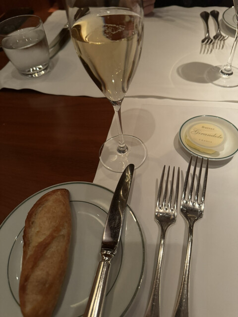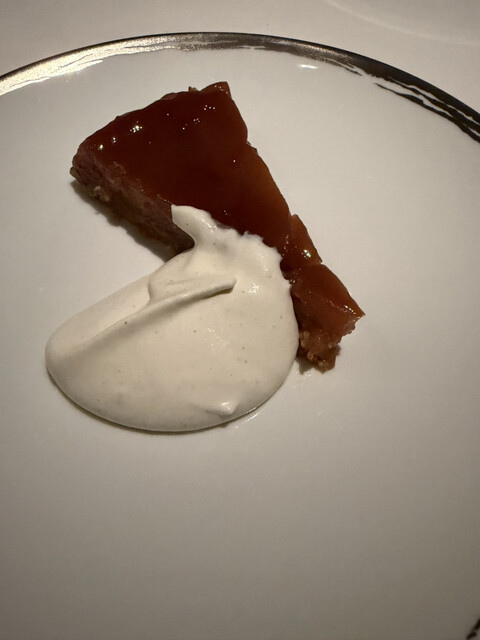 料理自体は、前菜に選んだ鴨フォアグラのラビオリ牛肉コンソメ仕立ては、コンソメを目の前でアルコールランプで温めて香草の香り付けを行うという見た目の演出に、コンソメの深い味わい。メインに選んだクエのヴァプールは、バターの効いたソースに2種類の貝と海藻が入って、淡白なクエを美味しく食べさせてくれる。切り分けて提供されるデザートのタルトタタンは、甘すぎない生クリームをたっぷりと添えられて、底の蕎麦の実のカリッとした食感も良い感じ。さらにチョコレートムース等も提供されて、大満足。改装後料理のクオリティがアップしており、これでワインがもう少しお手頃価格なら言うことない。