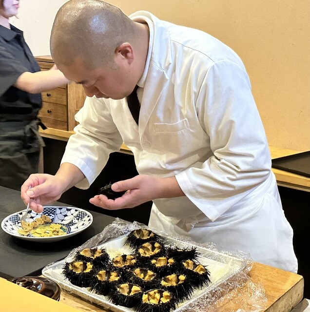 宮城県志津川(南三陸町)の殻付き雲丹丼仕込み中の生駒大将
