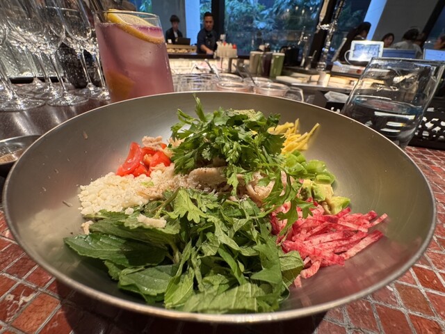 レンコンやカーボロネロの食感、香ばしい焼きネギ、さらにナッツのアクセントが効いていて、一口ごとに発見があります。