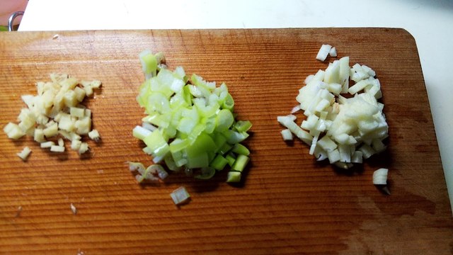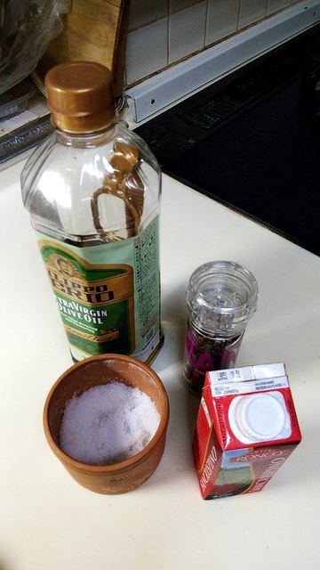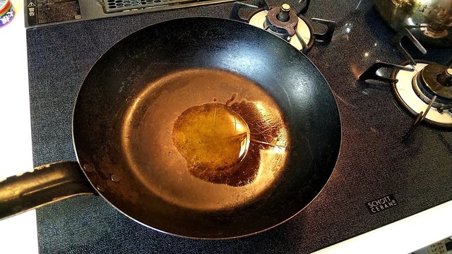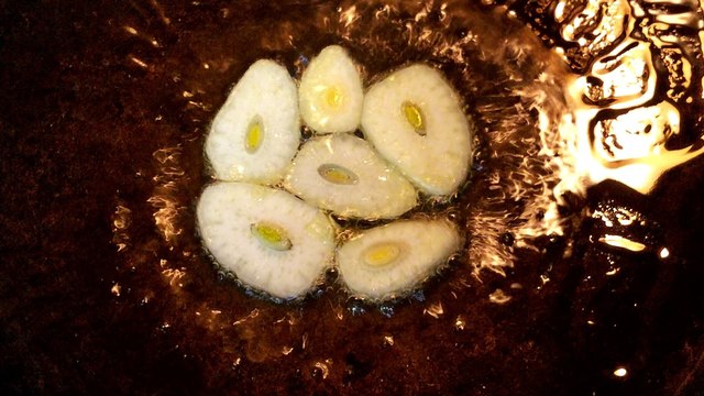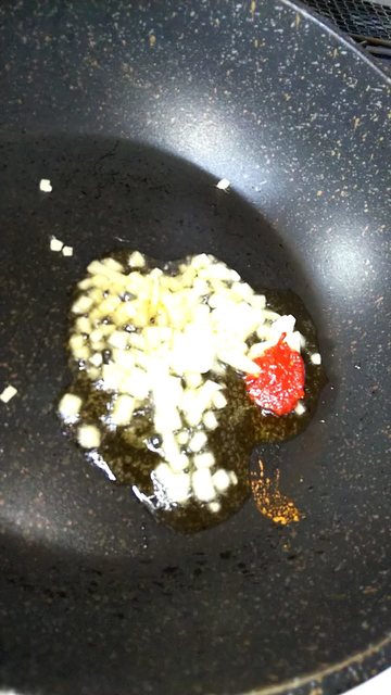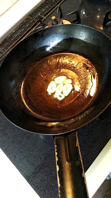 オリーブオイル大匙ニ杯と大蒜入れて弱火に掛けます。