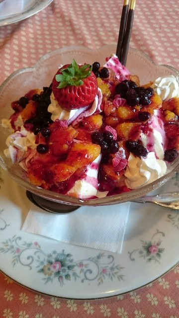 大きな器にアイス、レアチーズ、フルーツ、クリームがたくさんで見た目も美味しそう!