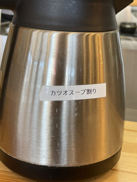 概ね食べ終わる頃に 先程の白衣を着たお姉さんがすっと出てきて 出汁割用のカツオスープを持ってきてくれた。素晴らしいタイミングだ。スープ割は1センチ入れて飲むとおいしいよとのアドバイス付き。